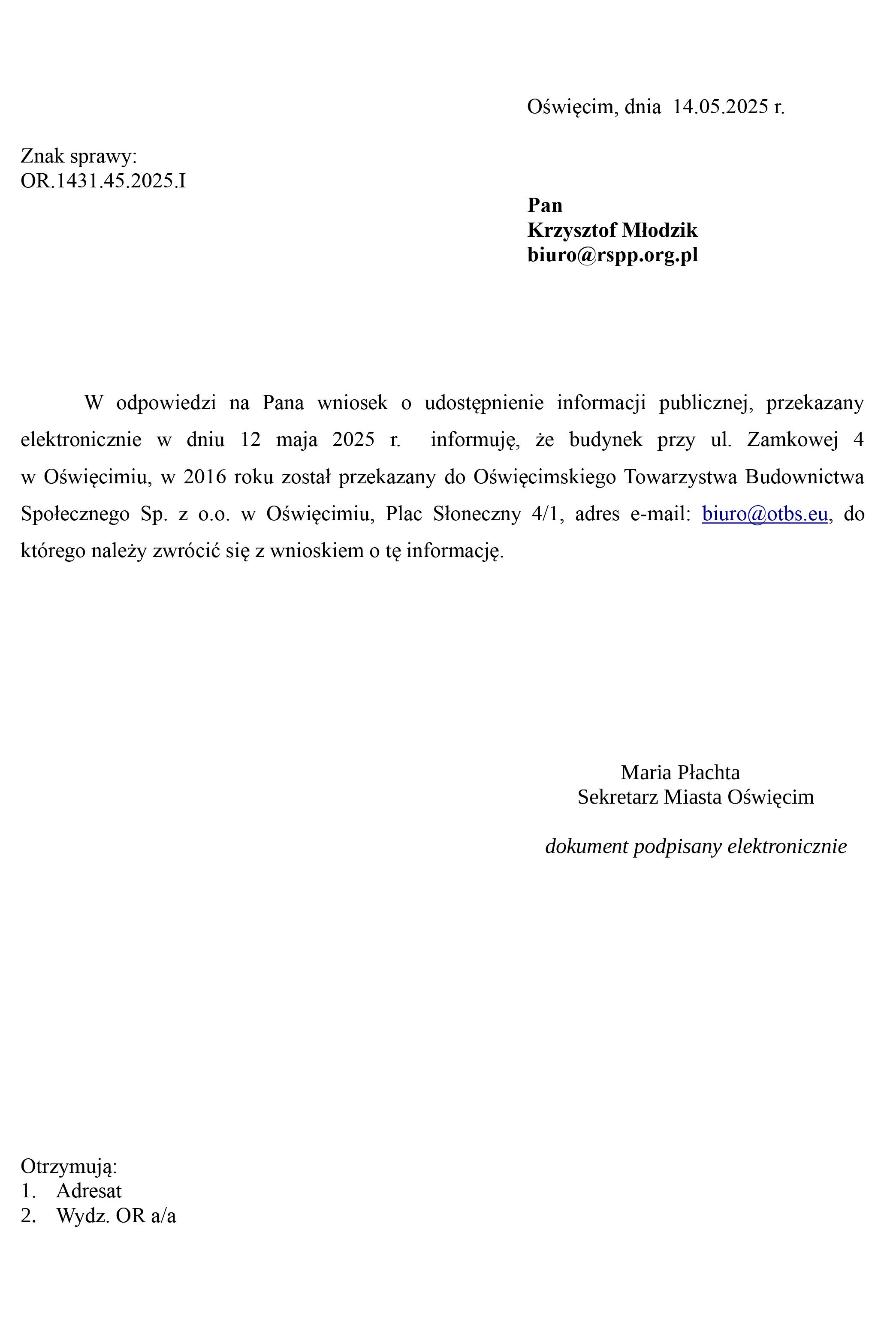 Z uwagi na informację zawartą w powyższym piśmie kierujemy nasze pytania do Oświęcimskiego Towarzystwa Budownictwa Społecznego w Oświęcimiu.