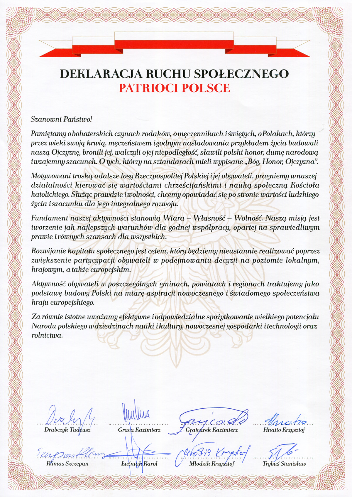Motywowani troską o dalsze losy Rzeczypospolitej Polskie i jej obywateli pragniemy w naszej działalności kierować się wartościami chrześcijańskimi i nauką społeczną Kościoła katolickiego. Służąc prawdzie i wolności chcemy opowiadać się po stronie wartości ludzkiego życia i szacunku dla jego integralnego rozwoju.