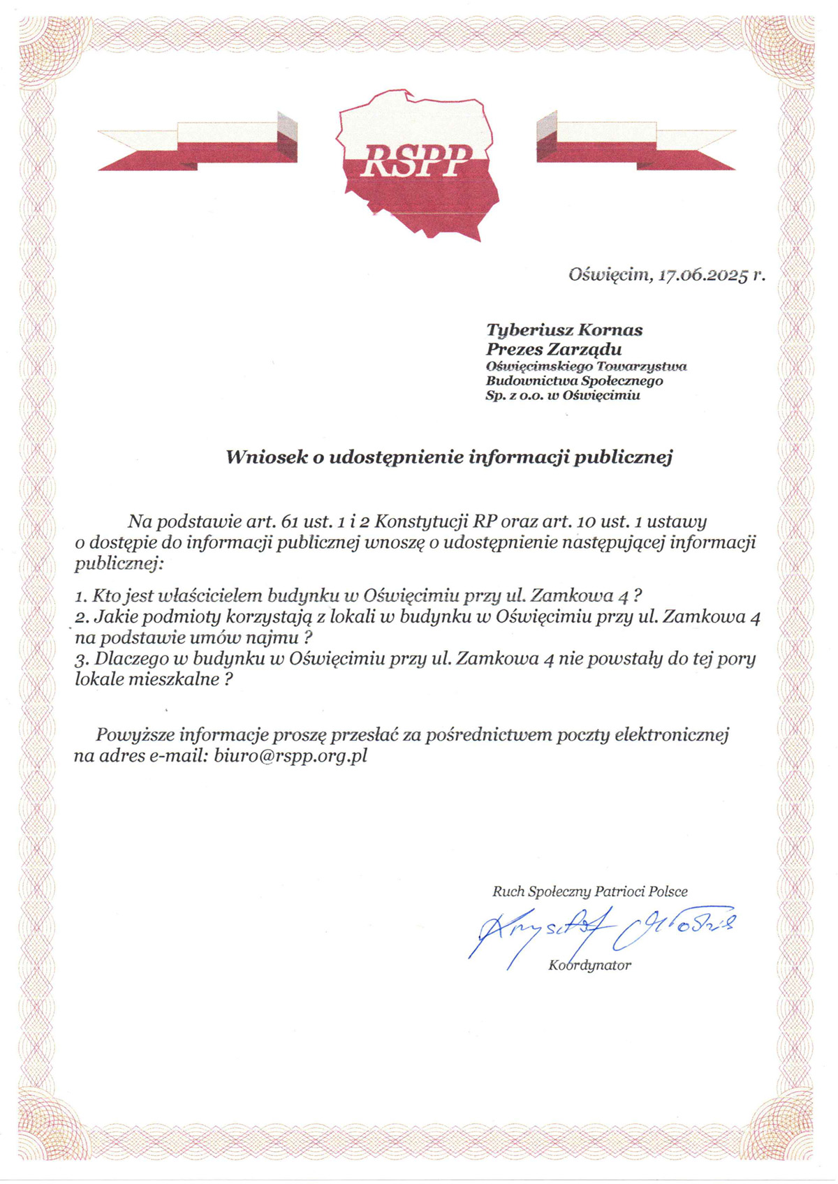 Z uwagi na informację zawartą w powyższym piśmie kierujemy nasze pytania do Oświęcimskiego Towarzystwa Budownictwa Społecznego w Oświęcimiu.